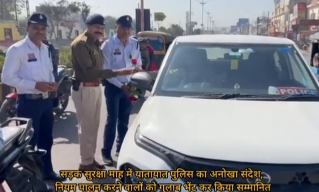 सड़क सुरक्षा माह में यातायात पुलिस की अनोखी पहल, नियम मानने वालों को गुलाब देकर किया सम्मान