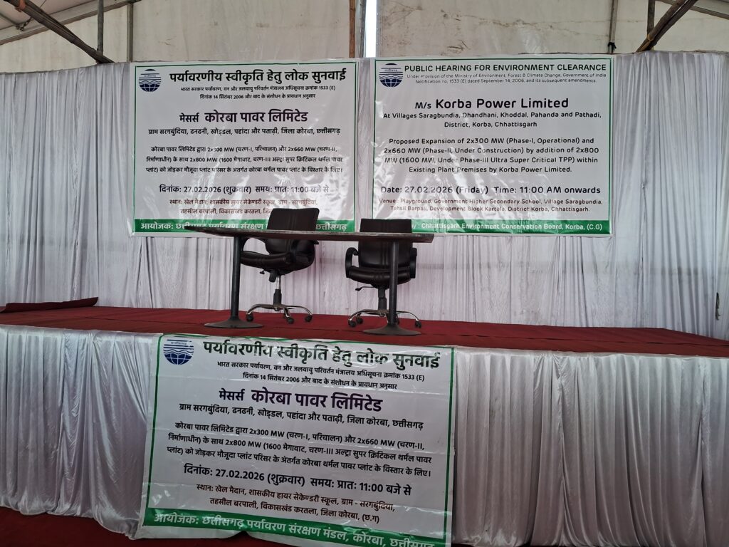 कोरबा। अडानी के मैसर्स कोरबा पावर लिमिटेड की प्रस्तावित विस्तार परियोजना के लिए पर्यावरणीय स्वीकृति हेतु लोक सुनवाई आज 27 फरवरी 2026 (शुक्रवार) को आयोजित की जा रही है। जनसुनवाई प्रातः 11 बजे से प्रारंभ होगी।