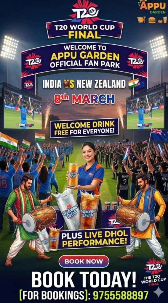 अप्पू गार्डन, जो अपनी सुंदरता और सुकून के लिए जाना जाता है, रविवार 8 मार्च को क्रिकेट के जोश और उत्साह से सराबोर रहेगा। प्रबंधन ने इस मेगा आयोजन को यादगार बनाने के लिए विशेष तैयारियां की हैं, ताकि दर्शकों को स्टेडियम जैसा अनुभव मिल सके।