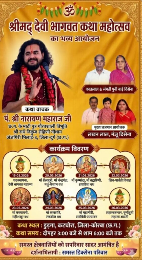 नवरात्रि पर कटघोरा के डुड़गा में 19–26 मार्च तक श्रीमद् देवी भागवत कथा महोत्सव, पं. नारायण महाराज करेंगे वाचन, लखन लाल डिक्सेना दंपति की पहल