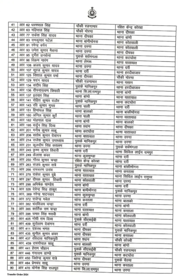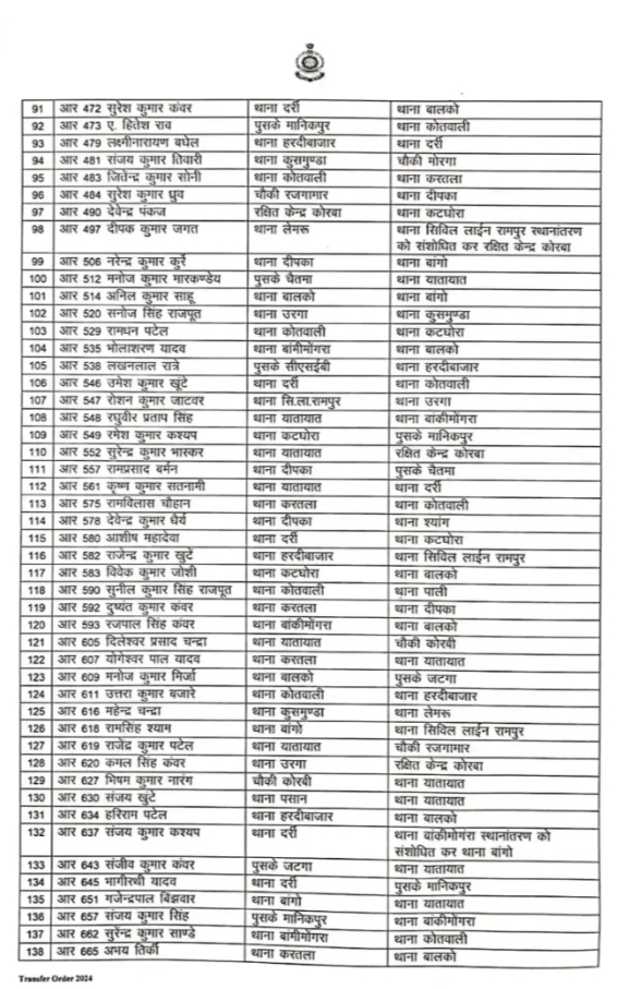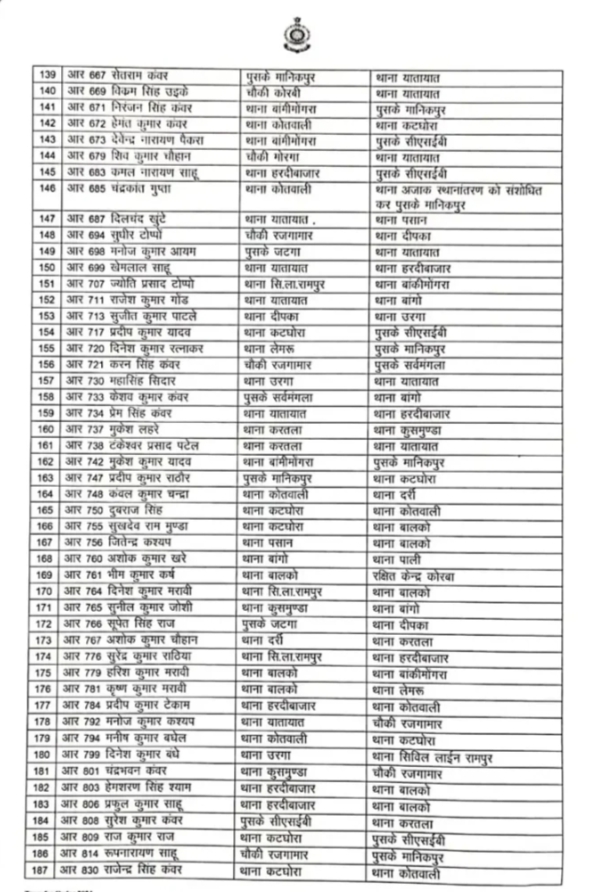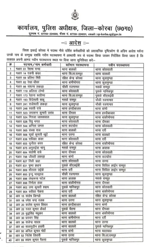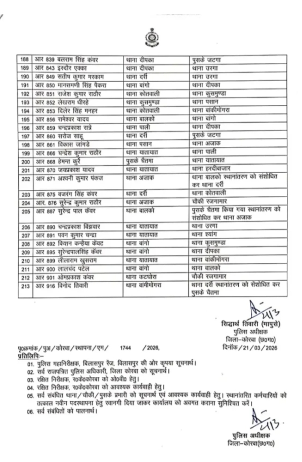 कोरबा। जिला पुलिस अधीक्षक सिद्धार्थ तिवारी ने जिला पुलिस बल के विभिन्न थाना-चौकी में सेवाएं दे रहे आरक्षकों की पदस्थापना में बड़ा फेरबदल किया है। कुल 213 आरक्षक और महिला आरक्षक इस फेरबदल से प्रभावित हुए हैं।