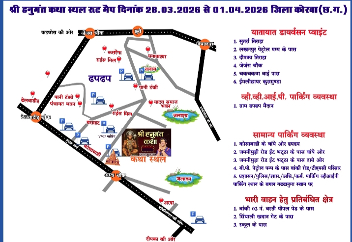 कोरबा। कोरबा जिले के बांकीमोंगरा क्षेत्र अंतर्गत ग्राम ढपढप के विशाल मैदान में बाबा बागेश्वर धाम सरकार पंडित धीरेंद्र शास्त्री की हनुमंत कथा के लिए जिला व पुलिस प्रशासन के द्वारा सुरक्षा और आवागमन की व्यवस्था के मद्देनजर पूरी तैयारी कर ली गई है। जिला पुलिस ने कथा स्थल तक आने-जाने का मार्ग से लेकर पार्किंग और प्रतिबंधित मार्ग के संबंध में रोडमैप (रूट) जारी कर दिया है।