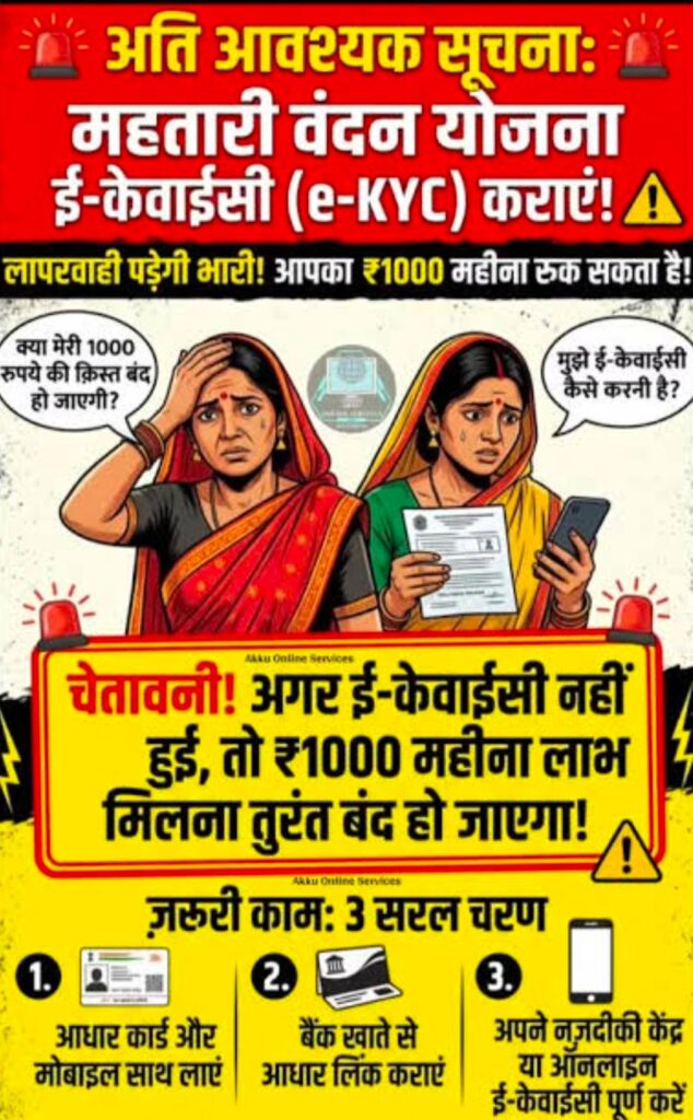 कोरबा।राज्य शासन के निर्देशानुसार महतारी वंदन योजना के अंतर्गत पंजीकृत सभी हितग्राहियों का ई-केवाईसी कराना अनिवार्य किया गया है। योजना का लाभ प्राप्त कर रही सभी पात्र महिलाएं यह सुनिश्चित करें कि वे निर्धारित समय-सीमा के भीतर अपना ई-केवाईसी अवश्य पूर्ण करा लें।