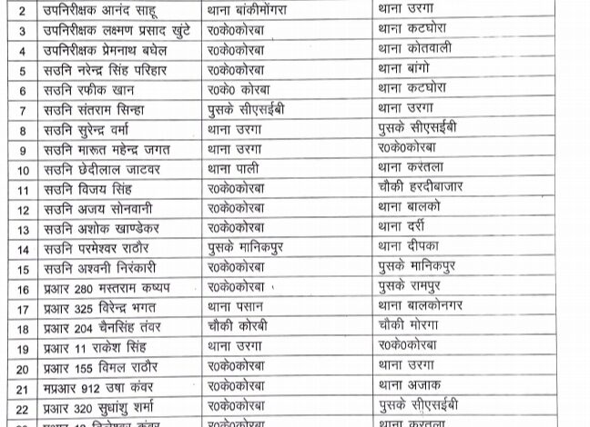 कोरबा। पुलिस विभाग में कसावट लाने के लिए कोरबा जिले के पुलिस अधीक्षक संतोष सिंह ने बुधवार को एक बार फिर से पुलिस विभाग में बड़ी सर्जरी की है जिसमें उप निरीक्षक सहायक उपनिरीक्षक प्रधान आरक्षक आरक्षक शामिल है बताया जाता है कि इस तबादले में कुल 81 अधिकारी कर्मचारी प्रभावित हुए हैं।