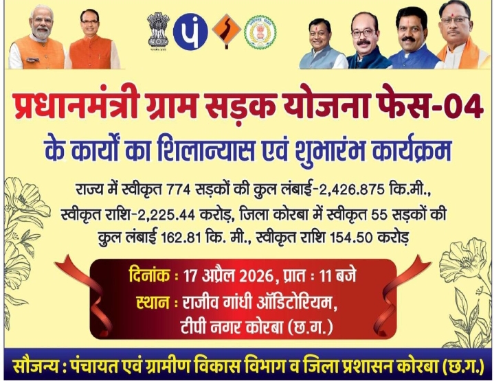कोरबा।प्रधानमंत्री ग्राम सड़क योजना (फेज-04) के तहत प्रदेश में विकास को नई गति देते हुए मुख्यमंत्री विष्णु देव साय ने जशपुर के रणजीता स्टेडियम में आयोजित कार्यक्रम में 2,225 करोड़ रुपए से अधिक की लागत से बनने वाली 774 सड़कों का भूमिपूजन एवं शिलान्यास किया। यह कार्यक्रम ‘प्रधानमंत्री धरती आबा जनजातीय ग्राम उत्कर्ष अभियान’ के अंतर्गत आयोजित किया गया, जिसका वर्चुअल प्रसारण सभी जिलों में किया गया।