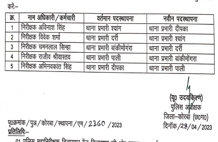 कोरबा। जिले में आज फिर दीपका, पाली, दर्री समेत 5 थाना के प्रभारी बदले गए। हालांकि पुलिस लाइन में मौजूद निरीक्षकों को इस सूची में भी मौका नहीं मिला है।थाना प्रभारी ही एक जगह से दूसरी जगह भेजे गए है। देखे सूची...