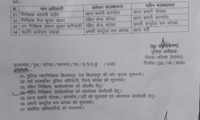 अश्वनी राठौर बने दीपका थाना प्रभारी, तेजराम को कटघोरा का बनाया गया प्रभारी