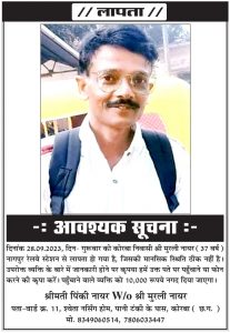 कोरबा के सिटी कोतवाली अंतर्गत पानी टंकी मोहल्ला निवासी मुरली नायर उम्र 37 केरल में एक कंपनी में कार्यरत था। जो बीच-बीच में वह शहर में परिवार से मिलने पहुंचता था। वह करीब 2 माह पहले 28/09/2023 को केरल से कोरबा लौट रहा था। इस दौरान मानसिक स्थिति बिगड़ने पर वह नागपुर स्टेशन से कहीं चले गए। हालांकि कलमना थाना क्षेत्र में मुरली नायर की मानसिक स्थिति को बिगड़ा देखकर एक व्यक्ति ने उनके मोबाइल के नंबर के आधार पर परिजन को उसके बारे में सूचना दी। परिवार जब तक नागपुर पहुंचा तब तक मुरली नायर वहां से लापता हो गए थे। परिजन ने मोबाइल से संपर्क किया तो वह अपने मौजूदगी का स्थान नहीं बता सके। बाद में उनका मोबाइल बंद हो गया। परिजन ने हर संभव तलाश की। लेकिन मुरली नायर का पता नहीं चला। मुरली की पत्नी पिंकी नायर ने निराश होकर शहर लौटने के बाद सिटी कोतवाली में गुमशुदगी की सूचना दी। पुलिस ने मामले में गुम इंसान कायम कर पतासाजी शुरू कर दी है। मुरली नायर के लापता होने के बाद पत्नी व उनके दो बच्चों समेत परिजन परेशान है। ऐसे में परिजन ने मुरली नायर के बारे में सूचना देने या उन तक पहुंचाने वाले व्यक्ति के लिए 10 हजार रुपए नगद इनाम देने की घोषणा की है।