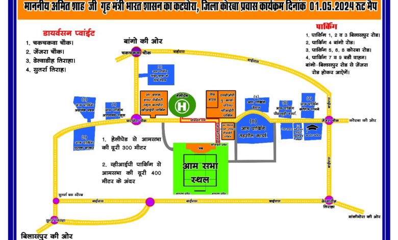 दिनांक 01.05.2024 को अमित शाह, माननीय केन्द्रीय गृह एवं सहकारिता मंत्री भारत सरकार, नई दिल्ली का कोरबा प्रवास प्रस्तावित है। व्हीआईपी महोदय को “Z+” MHA Security with ASL CRPF cover सुरक्षा प्राप्त है। पुलिस के द्वारा मैप जारी कर परिवर्तित मार्ग और पार्किंग स्थल की जानकारी दी गई है।