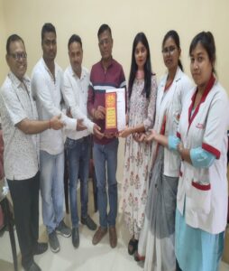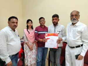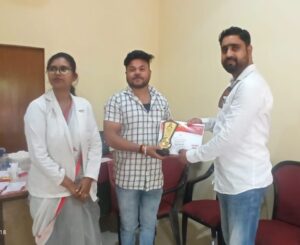मुख्य अतिथि के हाथों सम्मानित होते स्व. रमेश पासवान के सुपुत्र श्री अनूप पासवान